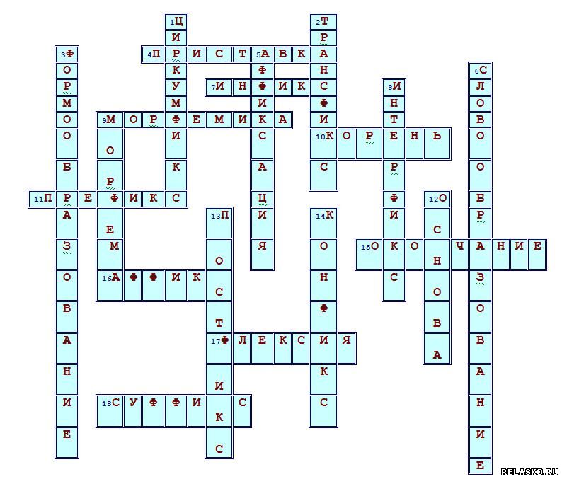 4. Значимая часть слова, стоящая перед корнем и служащая для образования новых слов. 7. Аффикс, занимающий позицию внутри корня при словообразовании или словоизменении. 9. Учение о значимых частях слова (морфемах) и морфемной структуре слова. 10. Общая неделимая часть родственных слов, являющаяся носителем основного лексического значения. 11. Традиционное название в лингвистике приставки. 15. Изменяемая часть слова, служащая для связи слов в предложении. 16. Морфема, которая присоединяется к корню и служит для образования слов. 17. В лингвистике так называется окончание. 18. Значимая часть слова, стоящая после корня и служащая для образования новых слов или грамматических форм слова.