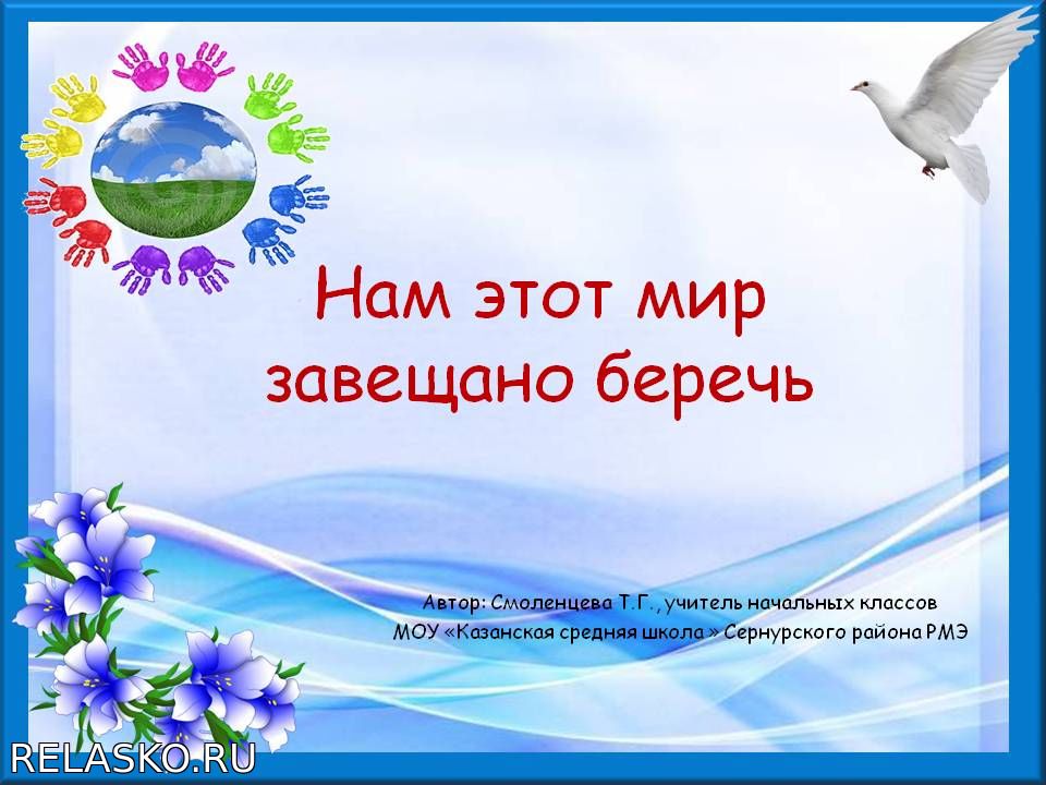 закреплять знания о государственной символике; развивать речь, логическое мышление, память; воспитывать чувство коллективизма, взаимопомощи Оборудование: компьютер, проектор, презентация, модель планеты из голубой бумаги, воздушные шары, трафареты голубей, цветная бумага, ножницы.