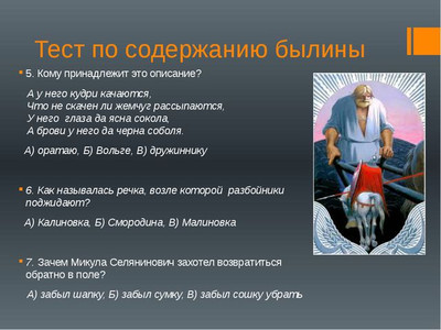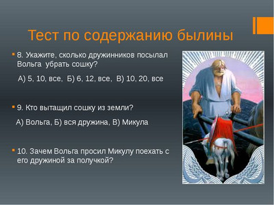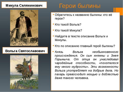 Предлагаем вам посмотреть пример доклад - презентация в картинках на тему "Былины. Вольга и Микула Селянинович. Садко" для классного часа начальной и средней школы России ФГОС УДД