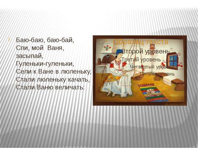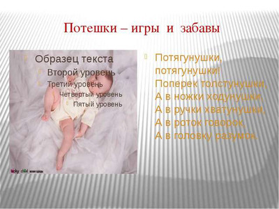 Предлагаем вам посмотреть пример доклад - презентация в картинках на тему "Потешки и прибаутки" для классного часа начальной и средней школы России ФГОС УДД