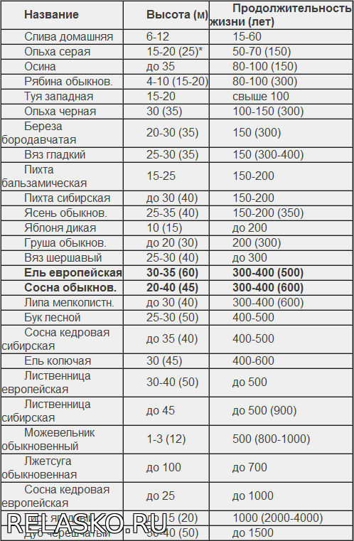 * В скобках – высота и продолжительность жизни в особо благоприятных условиях. 5000 лет - секвойя, баобаб .