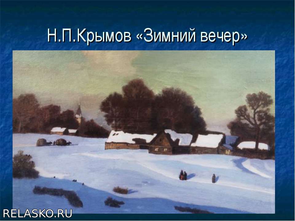 Передо мной картина Н. Крымова “Зимний вечер“. Разглядываю её, и всё изображённое на ней кажется мне знакомым. На большей части картины художник изобразил снег. Пушистый, густой, снег лежит везде: на земле, на крышах домов, он почти скрывает под собой небольшие кустики и бурьян на переднем плане.