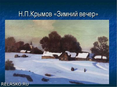 Мне кажется, что Н. П.Крымову важно было подчеркнуть обилие снега, потому что именно снег – это главная примета русской зимы. Художник изобразил зимний вечер на своей картине. На закате снежное пространство уже не блестит, краски приглушены. Солнце скрывается за горизонтом, его последние лучи меняют цвет снега. В тени он синеватый, и его хорошо видно, какой он глубокий и пышный. Там, куда ещё достают солнечные лучи, снег выглядит розоватым. Тропинки, протоптанные в снегу, заметны издали.