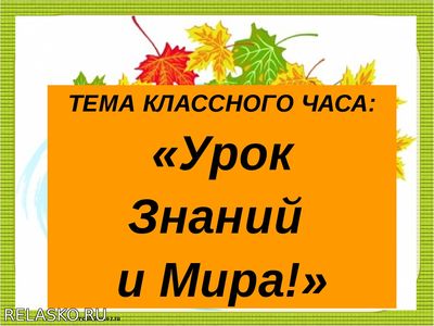 В советское время первый урок в День знаний всегда была Урок мира, сегодня тематика строго не обозначена. Конечно, многие стараются придерживаться классики и проводят открытые уроки именно на эту тематику. Что рассказать детям? О том, как важно жить в мире друг с другом и стараться избегать войны. Потому что, мирное время — это возможность получения образования, счастливой жизни, создания семьи. Детям можно показать фотографии из тех точек мира, в которых в данное время идут военные действия. От битв государств страдают обычные люди и, конечно, дети.