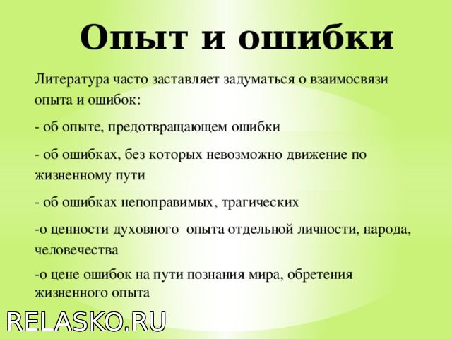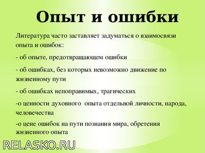 Говоря об опыте и ошибках, мне приходят слова советского филолога Д.С. Лихачева, который говорил: “восхищаясь умением фигуристов исправлять ошибки во время танца. Это искусство, огромное искусство”, но в жизни ошибок намного больше и каждому нужно уметь исправлять их, немедленно и красиво, ведь ничто так не учит, как осознание своих ошибок.