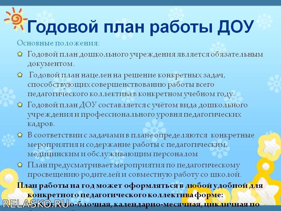 Годовой план работы на учебный год - это обязательный нормативный документ дошкольного образовательного учреждения.