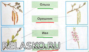Соедини линиями рисунки и названия. Сделай это самостоятельно или с помощью учебника. Названия деревьев подчеркни зелёным карандашом, кустарников - красным