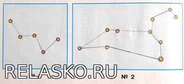 1. С помощью иллюстраций учебника соедини звезды так, чтобы на рисунке №1 получилась главная фигура созвездия Кассиопея, а на рисунке №2 - фигура Льва.