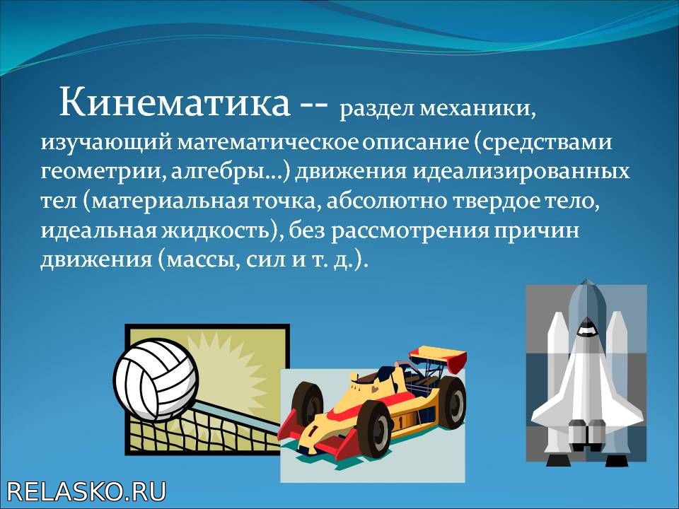 Кинематика - это раздел физики имеет греческое происхождение и дословно переводится как “двигаться”. Таким образом, мы получаем первоначальный, еще не сформированный по-настоящему ответ на вопрос о том, что такое кинематика. В данном случае можно говорить о том, что раздел изучает математические способы описания тех или иных видов движения непосредственно идеализированных тел.