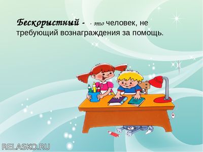 Прежде чем начать сочинение на данную тему, хотелось бы разобраться что же такое бескорыстие? Поговорили с мамой, она многое объяснила, рассказала случаи из жизни, процитировала Даля: «Бескорыстен тот, кто думает о других более, чем о себе.» Из разговора с мамой я подвела итоги: бескорыстие подразумевает под собой поступки ради других: без денежных вознаграждений, без взаимных подарков, долгов, вообще нежелание что либо получать взамен за добрые дела!