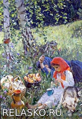 Теплое солнечное лето. Белые березы, одетые в яркую зелень, густая сочная трава и очень много света. Вот что первым делом обращает на себя внимание на картине «Летом». Эту картину нарисовал художник Пластов. Сразу видно, что он по-настоящему знал и любил природу. Все такое красивое и настоящее. На зрителя словно веет вкусным запахом трав и ягод и сонным покоем знойного дня.А что же еще изображено на полотне? Описание картины «Летом» Пластова может занять много времени. На ней нарисовано целых три героя. Это девочка со своей бабушкой и собачка. Они, наверное, ходили в лес по грибы и ягоды. А на обратной дороге они устали и присели отдохнуть прямо на траве. Бабушка крепко спит. Она одета в синее платье и такой же платок. Самый яркий элемент у нее – это рука, которой бабушка закрылась от солнца. Видно, какая она большая, смуглая и натруженная. Глядя на такую руку, можно понять, что человек работал всю свою жизнь.Внучка, я думаю, вырастет такой же труженицей. Вот и сейчас, пока бабушка спит, девочка сосредоточенно ощипывает ягоды с веточки в большую синюю кружку. Серьезное лицо маленькой помощницы показывает, что ей нравится эта работа. Девочка одета в легкое белое платье и украшена бусами. А на голове у нее повязан красный платок. Белый, красный и синий цвета очень красиво смотрятся вместе. Поэтому девочка сразу обращает на себя внимание зрителя.Рядом с бабушкой и внучкой лежит небольшая собачка. Она набегалась по лесу и теперь сладко спит, прижавшись к своим хозяйкам. У нее очень забавная мордочка, которую она повернула прямо к зрителям. Думаю, она любимица у своей маленькой хозяйки.А еще на картине нарисованы корзины с грибами и кувшин с ягодами. Они занимают почти половину полотна. Вот какой богатый урожай несут девочка и ее бабушка из лесу! Грибы крупные, яркие, а ягоды – сочные и спелые. Сразу понимаешь, какое богатство может подарить природа.Пока я писала сочинение по картине «Летом» Пластова, я задумалась о том, какой мирной и счастливой может быть крестьянская жизнь. Мы часто не замечаем красоту окружающего нас мира. Но счастливая жизнь может складываться из мелочей. Например – поход с близкими в лес, сбор своими руками вкусных ягод, отдых в тени. Думаю, именно это хотел показать художник своей картиной.