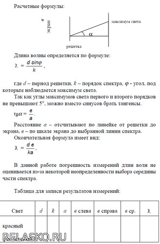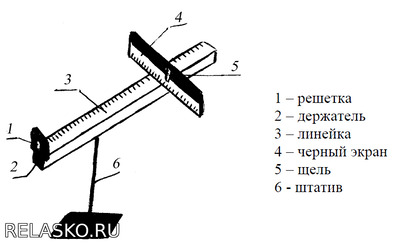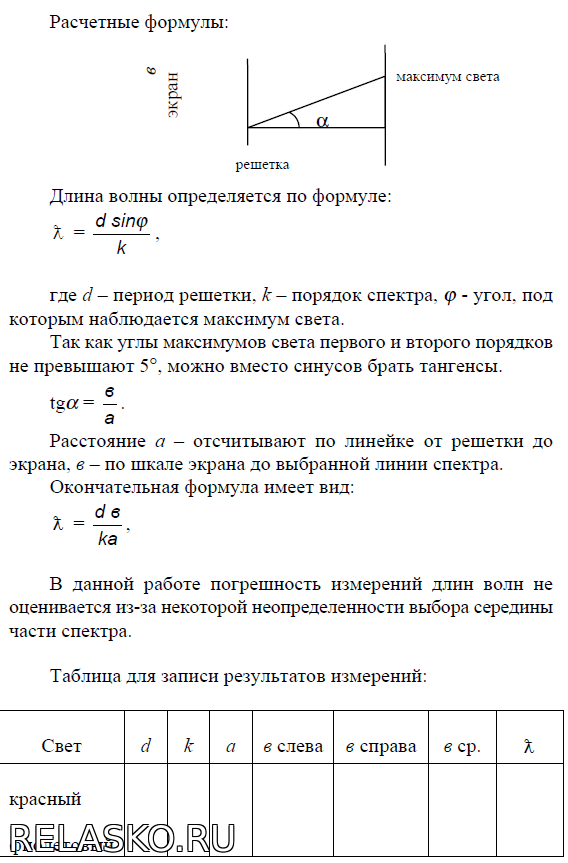 Цель работы: экспериментальное определение световой волны с помощью дифракционной решетки.Оборудование: Дифракционная решётка с периодом 1/100 мм или 1/50 мм,экран, линейка, источник света. Схема установки: