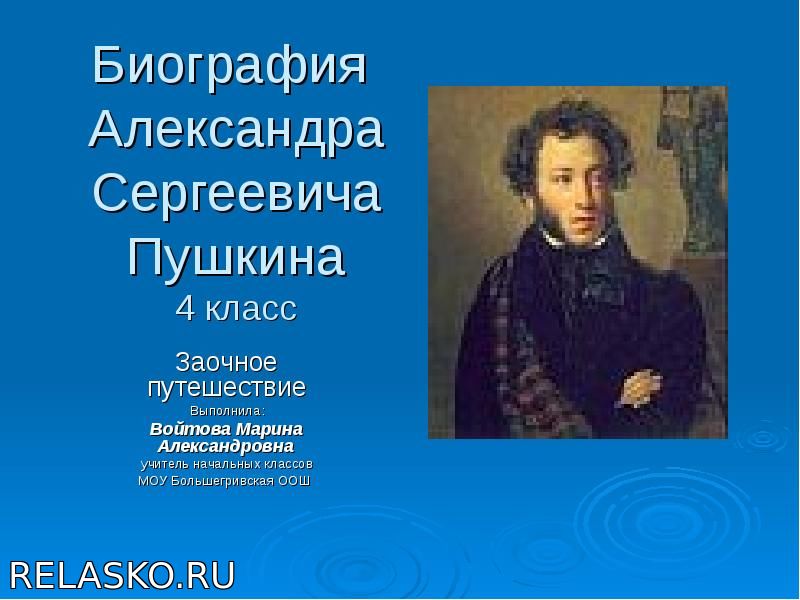 Предлагаем вам посмотреть и прочитать пример доклад - презентация в картинках на тему "Биография А. С. Пушкина" для классного часа начальной и средней школы России ФГОС, ФИПИ и УДД. Школа 21 века.