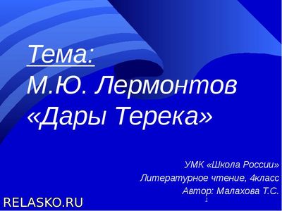Предлагаем вам посмотреть и прочитать пример доклад - презентация в картинках на тему " М. Ю. Лермонтов. Дары Терека" для классного часа начальной и средней школы России ФГОС, ФИПИ и УДД. Школа 21 века.