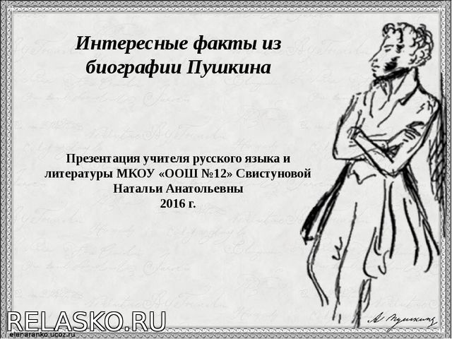 Предлагаем вам посмотреть и прочитать пример доклад - презентация в картинках на тему "Интересные Факты Из Биографии Пушкина" для классного часа начальной и средней школы России ФГОС, ФИПИ и УДД. Школа 21 века.