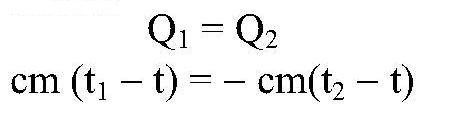 Если в калориметр налить воды массой m1 при температуре а затем еще добавить воды массой m2 при температуре t2 , то в сосуде начнется теплообмен, а спустя некоторое время установится состояние теплового равновесия. При этом обе части воды будут иметь одну и ту же температуру t, и количество теплоты, отданное горячей водой, равно количеству теплоты, полученной холодной водой. Последнее утверждение составляет смысл уравнения теплового баланса: