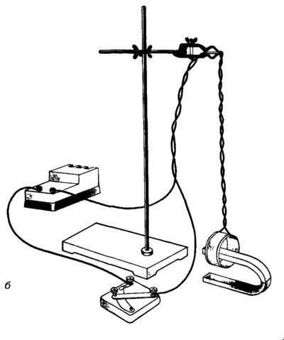Оборудование: штатив с муфтой и лапкой, источник питания, проволочный моток, дугообразный магнит, ключ, соединительные провода.