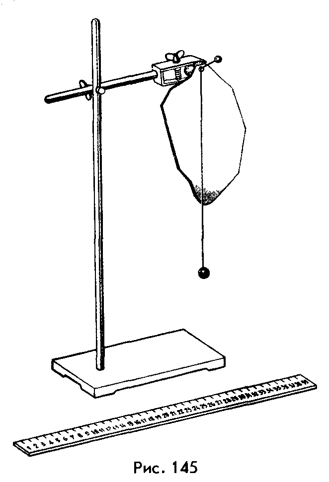 3. Вставив булавку в одно из отверстий, подвесьте пластину к пробке, закрепленной в лапке штатива (рис. 145).