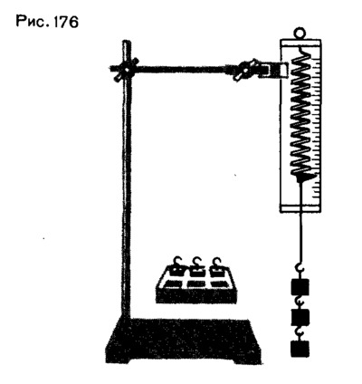 1. Закрепите на штативе конец спиральной пружины (другой конец пружины снабжен стрелкой-указате-лем и крючком — рис. 176).