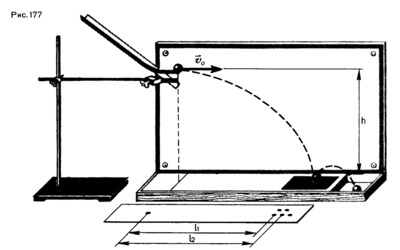 1. С помощью штатива укрепите фанерную доску вертикально. При этом той же лапкой зажмите выступ лотка. Загнутый конец лотка должен быть горизонтальным (см. рис. 177).