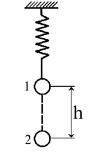 Рассмотрим груз, прикрепленный к упругой пружине таким образом, как показано на рисунке. Вначале удерживаем тело в положении 1, пружина не натянута и сила упругости, действующая на тело равна нулю. Затем отпускаем тело и оно падает под действием силы тяжести до положения 2, в котором сила тяжести полностью компенсируется силой упругости пружины при удлинении ее на h (тело покоится в этот момент времени).