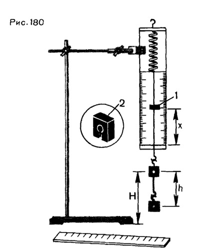 Если поднять груз, висящий на крючке динамометра, так, чтобы пружина не была растянута, то потенциальная энергия груза по отношению, например, к поверхности стола равна mgH. При падении груза (опускание на расстояние x = h) потенциальная энергия груза уменьшится на