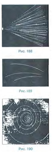 Задание 1. На двух из трех представленных вам фотографий (рис. 188, 189 и 190) изображены треки частиц, движущихся в магнитном поле. Укажите на каких. Ответ обоснуйте.