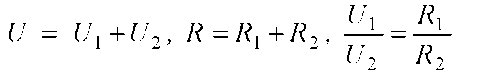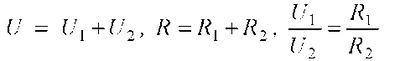 Соберем цепь для изучения последовательного соединения резисторов. Измерим напряжение на концах рассматриваемого участка и на каждом из проводников, тогда общее напряжение будет равно сумме напряжений на каждом проводнике: U = U1 + U2, а значение резистора будет равно сумме значения каждого резистора: R = R1 + R2 и отношение будет равно