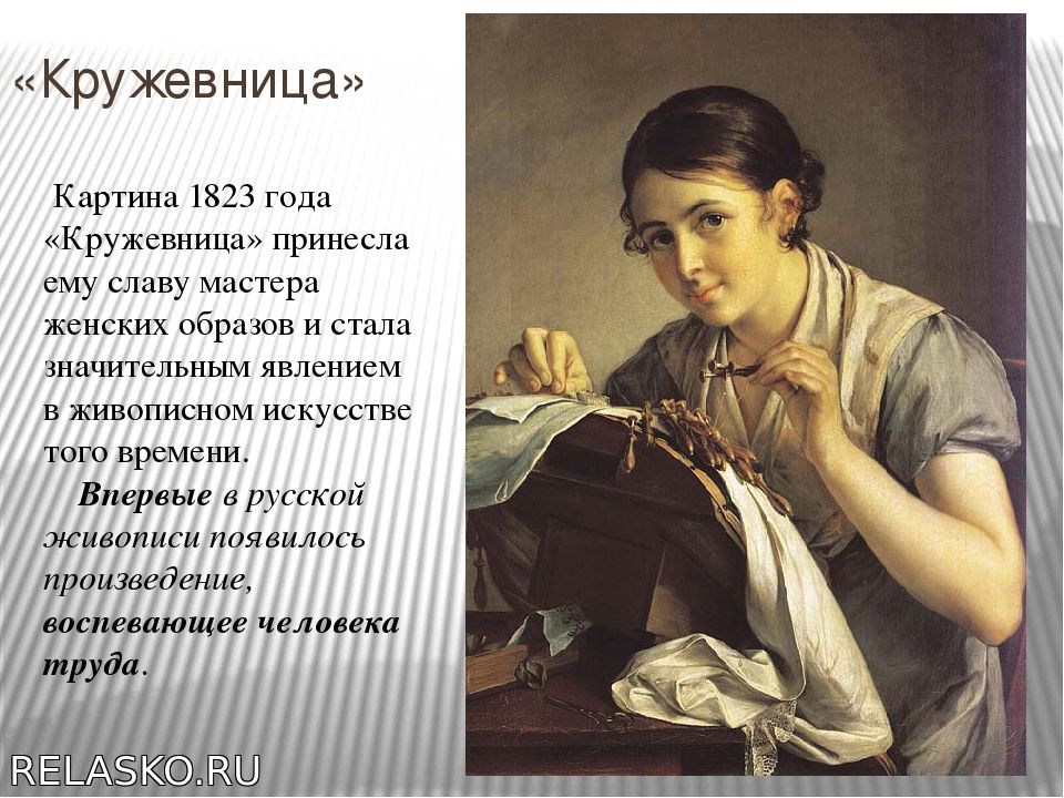 Картина «Кружевница» была написана русским художником В.А. Тропининым и является одной из самых известных его работ. На ней он изобразил молодую девушку, занятую работой над кружевом. Очевидно, что она очень добра и приветлива. Об этом говорят и выражение ее миловидного лица, и глаза, в которых притаились смешинки.