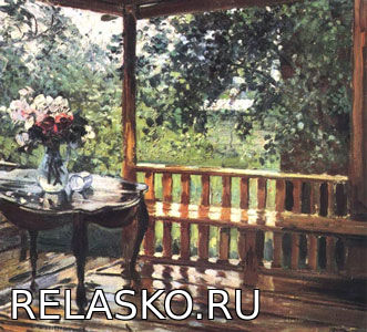 Настолько точно написать минуты летнего затишья после грозы, Александру Михайловичу удалось с помощью невероятно искусного сочетания цветов в палитре картины. Насыщенные темно-зеленые оттенки, контрастно перекликаются с нежными, светло-зелеными красками травы, освещенной мягкими лучами солнца. Чем темнее тени пропитанной влагой деревянной террасы, тем ярче выписаны пятна света на ее перилах.