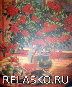 А над всем этим возвышается главный образ натюрморта, его сердце, его главный цветовой и смысловой акцент - букет рябины. Алые ягоды выглядят наряднее, чем цветы. Тяжелые рябиновые кисти согнули ветки. Необычный осенний букет почти полностью загораживает окно и доминирует в картине, задает в ней тон. Красный цвет обильных рябиновых гроздьев дает отблеск на все вокруг и меняет цвет предметов: все отдает спелой осенней краснотой, на всем вокруг лежат красноватые блики. Этот оттенок красного и создает впечатление роскоши - простые привычные осенние дары выглядят настоящим сокровищем.
