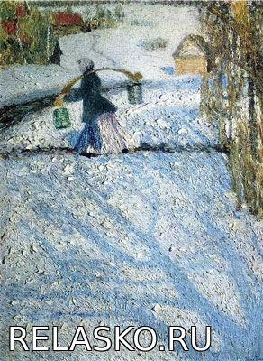 Главным акцентом картины является женщина, стремительно несущая на коромысле два полных ведра с водой. Это мое личное мнение, что они полные. Я так считаю потому, что они висят отвесно вниз, а в фигуре селянки чувствуется напряжение и стремительность, как если бы она хотела побыстрее справиться со своей задачей и не желала ее растягивать во времени. Атмосфера неподражаемого колорита русского села чувствуется во всем: в одежде женщины – практичной, теплой телогрейке и удлинённой юбке, в виднеющихся вдали домах, в широких свободных просторах. Тропинка, по которой идет девушка, часто используется людьми, ведь она хорошо протоптана. Удаленность источника воды от места обитания – это большая проблема, с которой мало кто будет уживаться, поэтому можно предположить, что ее дом где-то совсем рядом, не в зоне охвата картины. Почему? Да потому, что бегать за водой по нескольку раз за день, преодолевая пару километров, - это терять силы понапрасну. Лес, деревья вокруг – признак залегания воды на приемлемой глубине.