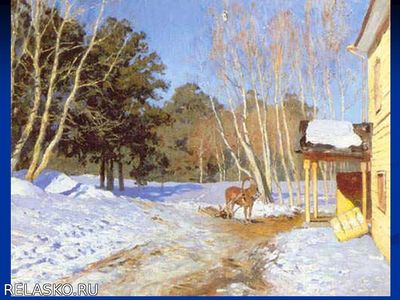 На этом полотне художника предстает то время, когда во всем ощущается скорый приход весны. Это первый календарный весенний месяц – март. Еще лежат кругом сугробы снега, но безоблачная голубизна неба как бы говорит о том, что, хоть и не отступили еще совсем холода, но довольно скоро уже солнце будет пригревать намного сильнее. И уже пригревает понемногу.