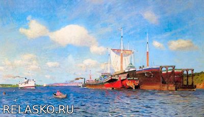 От ветра на величественной Волге появляются небольшие волны. У причала стоит большой красный корабль, мимо него проплывает деревянная лодка с людьми. А вдалеке виднеется белый пароход, который, наверное, вот-вот подплывет к причалу. Все на картине наполняется жизнью и движением.