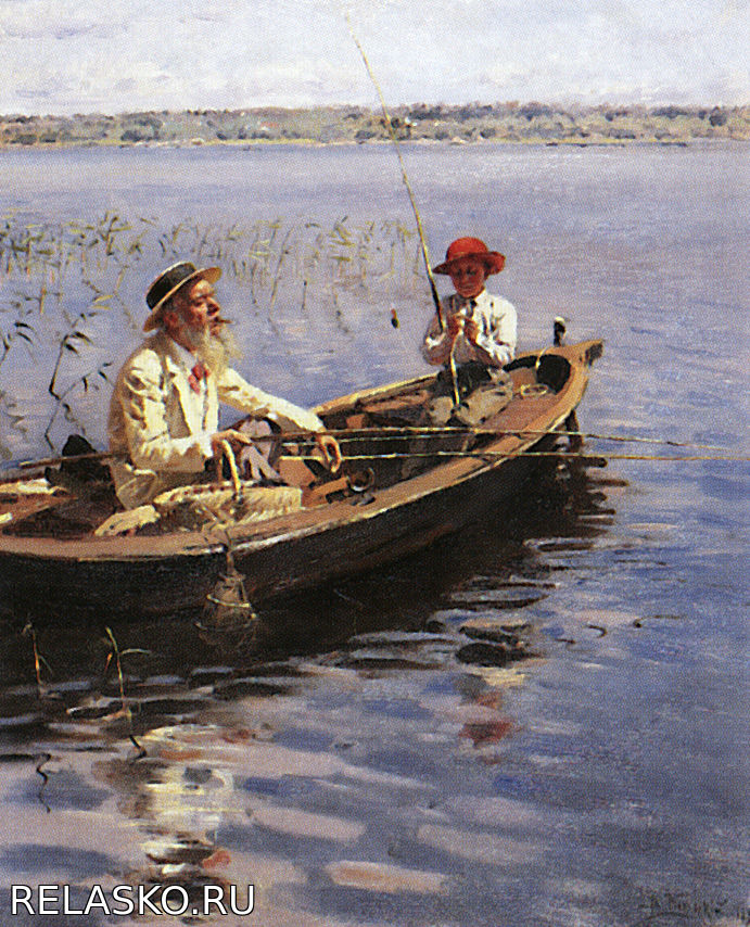 На картине Владимира Егоровича Маковского изображен летний день, два человека в лодке рыбачат. Один из них еще совсем маленький, второй старше, похож на дедушку. Они наслаждаются природой, погодой и рыбалкой. Одежда героев картины не совсем типична для места, так как пожилой мужчина одет в официальный костюм светлых тонов, а ребенок в рубашку и брюки, которые не носились крестьянами и рыбаками. То есть эти люди принадлежат высшему обществу, а на рыбалку они выбрались просто отдохнуть. Картина написана в стиле реализма.