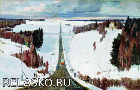 Дорога занимает центральное место на картине. Она режет пространство пополам, как бы показывая свое превосходство и значимость. И действительно, для человека она имеет колоссальное значение - соединяет Подмосковье с Москвой и другими путями. Но каких трудов и лишений стоило ее строительство? Характерно, что на дорожном полотне отсутствует снег, который лежит лишь по обочинам. Цветовой контраст снега и дороги дает их противопоставление. Снег всегда ассоциировался с чистотой, невинностью и красотой природных явлений, но там, где ступает нога человека идиллии нет места...