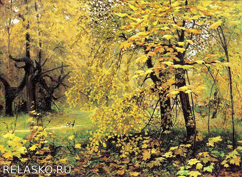 И вот уже ни на одном дереве не видно ни единого зеленого листочка. Кажется, что пришел волшебник и взмахом волшебной палочки перекрасил их все до единого в желтый цвет. Из летней зелени на картине я вижу только траву, и то она виднеется лишь в некоторых местах, а в основном и она уже пожелтела от упавших листьев, которые укрывают ее золотистым ковром. И так хочется переместится в эту картину и пробежаться по листьям, услышать, как они шуршат под ногами, почувствовать прилив сил и энергии, которые дает эта природа. Или наоборот, осторожно ступить в это золотое царство, чтобы не потревожить его величие и красоту, чтобы насладиться этим незабываемым моментом, как это делают две сороки, изображенные в центре картины.