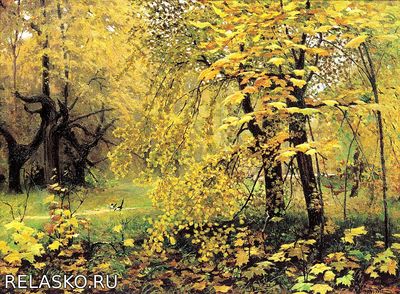 Очень красивая картина, с помощью красок автор передаёт яркое настроение. Используя золотые краски, автор рисует золотую осень, похожую на живую. Поляна как настоящая и прямо светиться желтизной.