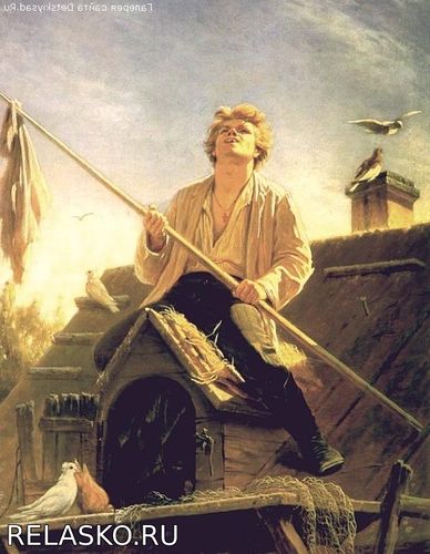 На картине Василия Перова “Голубятня” изображен молодой человек – голубятник, он находиться на крыше, и занимается со своими питомцами, на его лице можно точно прочесть черты счастья, что вполне объяснимо.