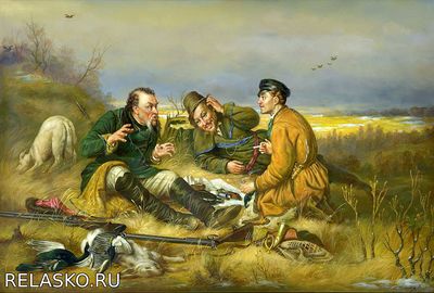 Эту картину я помню с самого детства. Точная её копия, купленная в магазине, висела на стене в доме бабушки и дедушки. Сюжет незатейливый и простой. Три охотника устали и присели отдохнуть на полянке у спиленного дерева, от которого остался только пень. В траве на переднем плане картины лежат добыча, ружья, охотничий рожок и какие-то вещи. Между охотниками на куске ткани лежит еда - каравай чёрного хлеба, луковица, и металлический стаканчик. Как водится у мужчин, каждый начинает рассказывать охотничьи байки и хвастаться своими трофеями. Судя по всему, крайний справа охотник принимал участие в охоте первый раз, он без трофеев. Возле него не лежит убитая дичь.