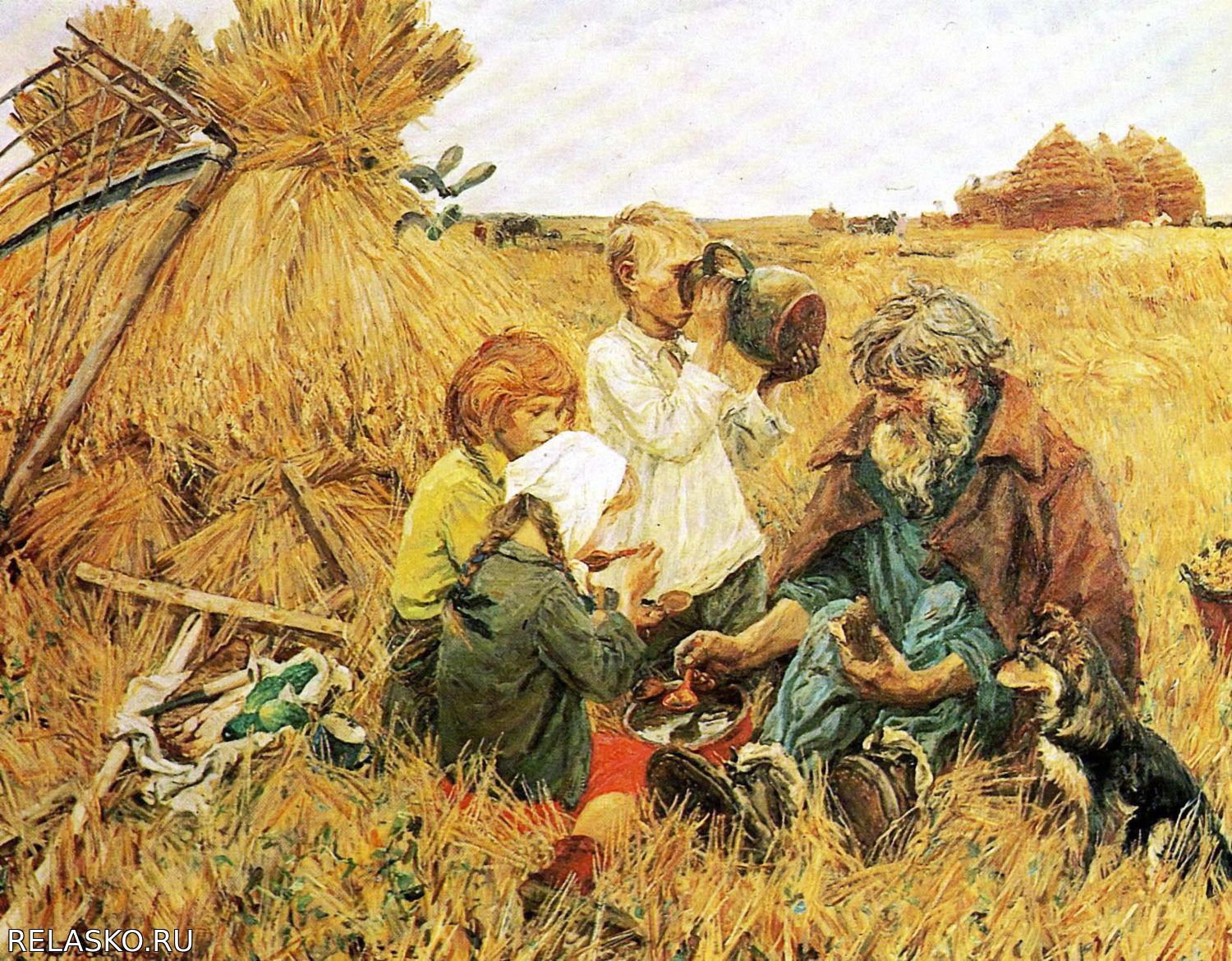 А после работы, около снопа присела пообедать семья. Дедушка и мальчик с девочкой чинно берут ложками из чашки еду. Другой мальчик пьет из кувшина воду, а может быть молоко. В таком кувшине вода не нагревается и долго остается холодной, в летнюю жару очень приятно выпить холодной водицы. За их действиями с интересом наблюдает пес, "чистопородный дворянин", а короче говоря дворняжка. Он надеется, что и ему что-то перепадет, кажется, он вот-вот тявкнет, обращая на себя внимание. Люди одеты в домотканую, простую одежду, у старика на ногах обувь, потому, что на стерне легко поколоть ноги, а обычно и взрослые и дети летом ходили босиком. Самой колоритной фигурой на картине является старик. Он бородат, седые, густые волосы не причесаны, у него тяжелые, натруженные руки. В одной руке он бережно держит кусок черного хлеба, в другой руке у него деревянная ложка, которой он зачерпнул еду. Синяя рубаха и синие штаны довершают его наряд. Спиной к зрителю сидит девочка. У нее волосы заплетены в две косички, на голове платок. Она одна носит Что-либо на голове, остальные персонажи сидят с непокрытыми головами. У девочки красная юбка и ботиночки с носками.