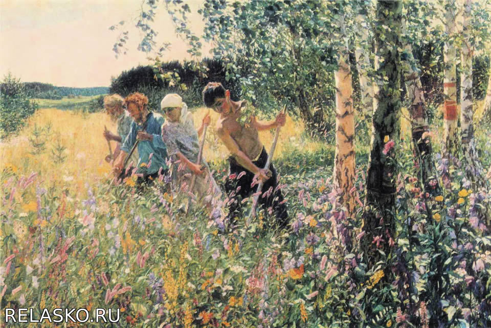 Художник выбрал самые яркие краски, которые мог выдумать человек. На картине пестреют красные, фиолетовые и лиловые цветы. Они притаились среди обычной травы, которую скоро скосят. А за всем процессом наблюдают стройные березки, которые являются национальным символом. Картина мне очень понравилась из-за своего яркого исполнения и сюжета. Она прославляет простой труд и показывает его с идеалистической стороны. Хочется верить, что эта картина напомнит человеку, что не только приборы могут выполнять всю работу, но работать должен и человек.