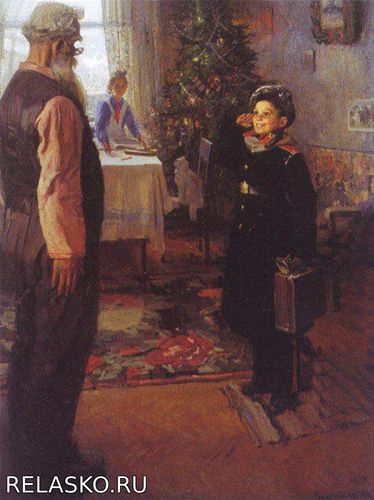 Автору удалось создать на полотне атмосферу праздника, елка, наряженная в углу комнаты, торжественная и радостная встреча. Я думаю, что дедушка для внука, является примером подражания, тем более, что отец погиб на войне. А внук в свою очередь очень любит дедушку, не только за то, что он дает ему сладости, но и за то, что он рассказывает ему разные военные истории. Ведь отца не осталось и нужно жить дальше, нужно искать свой идеал, на кого не стыдно быть похожим, кем ты гордишься и не стесняешься познакомить с друзьями. Мне очень понравилась эта картина. В ней много, семейного тепла, и уюта. В эту семью хочется возвращаться, потому что знаешь, что тебя там всегда ждут и тебе всегда рады