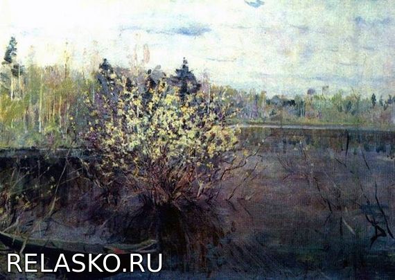 Пейзаж «Вербы в половодье» посвящен изображению ранней весны, которая, с одной стороны, прекрасна и долгожданна, но с другой – своенравна и очень изменчива. Она чем-то напоминает нам юную капризную красавицу. Погода меняется то и дело. Тепло и холод, солнце и дожди по очереди захватывают власть над природой. Весна настойчиво утверждает свои права.