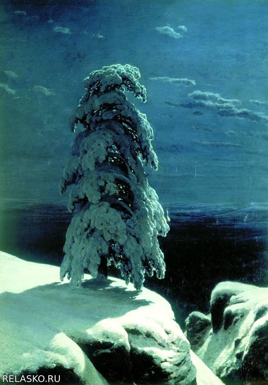 Разглядывая полотно можно увидеть одинокую сосну, присыпанную суровыми снегами. Стоит она на самом краю пропасти. Если вы прочтёте этот стих - то нетяжело уловить логическую нить – это одиночество. Шишкин заметил это моментально, и взялся писать эту картину. Место, на котором стоит дерево, засыпано снегами и покрыто льдом, всё это показывает её неприступность. Лишь лунный свет немного её освещает и не даёт скрыться во тьме суровой северной ночи.