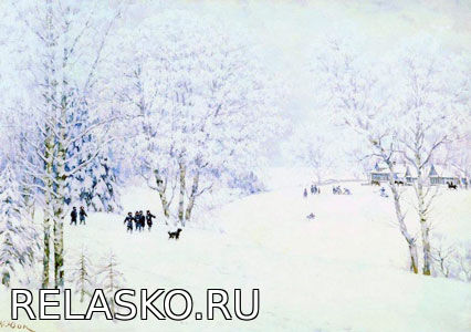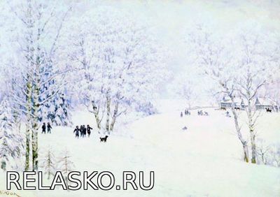 Гораздо меньше места занимают люди (деревенские ребятишки), создающие динамику, вносящие нечто неспокойное, живое в заколдованный молчаливый пейзаж. Ребятня делится на две категории: слева - те, кто мечтательно прогуливается в лесочке, поднимая высоко головы вверх - убедиться, а там также красиво и загадочно, как здесь, на земле? И вторая группа - те, что заняты активным делом - строительством горок, катанием на санях.