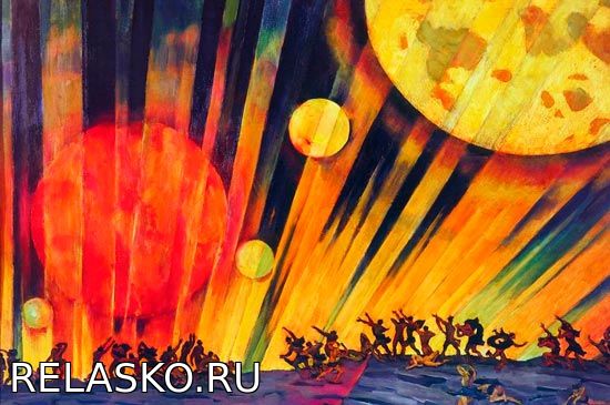 Это полотно было создано художником в 1921 году – в тот период времени, когда молодая российская республика переживала братоубийственную Гражданскую войну, а через год будет создана одна из самых величайших империй в истории человечества – Советский Союз. Художник понимал, что великие государства рождаются словно новые планеты в огне и ослепительном свете. Государства рождаются в крови и ужасе, и поэтому цвет новой планеты – кроваво красный, а люди, которые остались на старой и холодной планете либо приветствуют новый мир, и тянут к его сиянию свои руки, либо падают в ужасе, понимая, что произошедшее – уже неизбежно. Есть и те, кто смирился с этой неизбежностью, но закрыл свои глаза, потому что вынести сияние нового мира очень трудно.