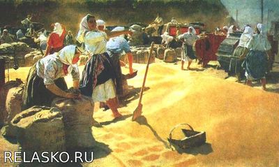 Собрали уже много зерна, вон, сколько мешков стоит подальше. Там мужчины грузят их в машины, чтобы увезти с поля в деревню. Народу много, все дружно работают и такая работа совсем не в тягость. Люди радуются богатому урожаю и возможности жить мирно и спокойно. Горячее солнце дарит свое тепло, а хорошая погода поднимает настроение. Зерна рассыпаны по всему полю, они хранят тепло и сверкают в солнечных лучах.