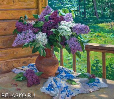 Его картины находятся не только в России но и в двадцати странах мира. На переднем плане картины мы видим огромный, пышный букет сирени. Букет состоит из нескольких нежных цветов: белого, нежно-голубого, бордового и сиреневого оттенка . Цветочки маленькие,милые и хрупкие. Можно сказать что букет свежий, только что сорванные ветки. Ещё мы видим что сирени стоят в глиняной вазе. Ваза вся старая, она уже теряет свой цвет. Сирени стоят на деревянном столе. На столе ещё есть белый кружевной платок с красивыми голубыми узорами.
