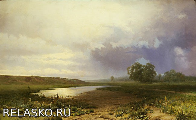 Пейзаж Ф.А. Васильева «Мокрый луг» сразу приковывает внимание зрителя своей красотой и узнаваемостью родной природы. Недавно была гроза, но она уже уходит. Дождь ушел к дальнему лесу, на горизонт. Наверное, оттуда время от времени глухо доносятся раскаты грома. А на переднем плане погода переменилась. Хотя в небе над лугом все еще теснятся темные, мрачные и лохматые грозовые тучи, сквозь них робко и светло пробивается горячее солнце. Оно отражается в заводи, мягко освещает весь пейзаж - мокрую землю, сочные травы и крутой косогор, протянувшийся вдоль воды.